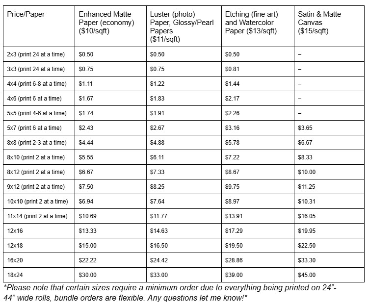 - Economy Enhanced Matte=$10 sqft - Luster Paper (photo)=$11 sqft - Etching Paper (textured fine art)=$13 sqft - Watercolor Paper (textured matte)= $13 sqft - Metallic Paper (Pearl Paper)=$13 sqft - Canvas (matte or satin)=$15 sqft